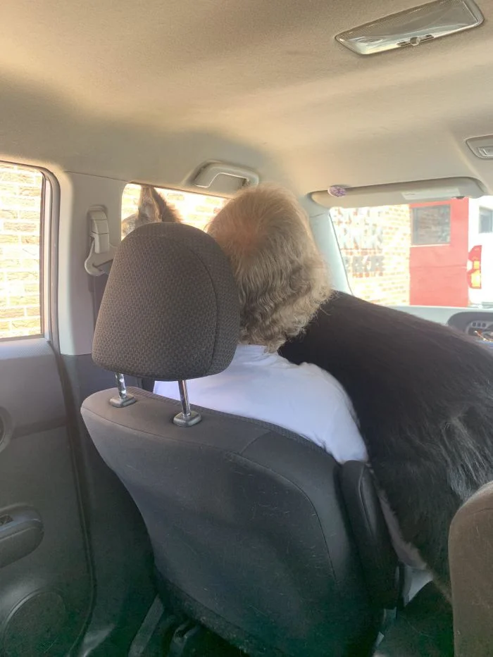 13. Нашего пса приходится пристёгивать в машине, иначе он сразу залезает на коленки водителю