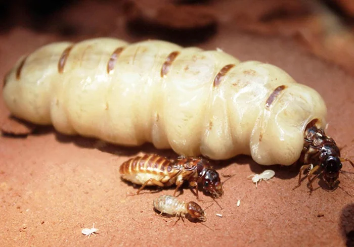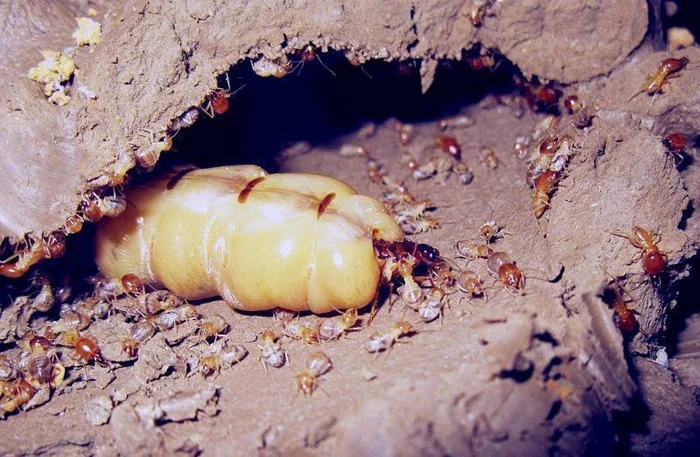 Поначалу самка термита обладает довольно скромными размерами и яйца откладывает в умеренных количествах: 10-20 штук в день. Но чем старше она становится, тем больше разрастается её брюшко. Спустя пару лет непрерывных родов матка достигает воистину королевских размеров — до 11 сантиметров. При том, что размер термита-солдата — всего 2 сантиметра! При таких габаритах матрона уже ни летать, ни даже просто ходить не может.