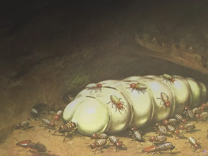 Королева в несколько десятков раз крупнее любого рабочего термита. По сути она – гигантская фабрика по производству яиц.