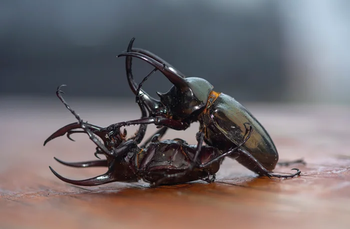 Однако, если вы не вздумаете бодаться с таким лосем за сердце его прекрасной членистоногой дамы, то отростки вам ничем не грозят. Атласные жуки в духе старых добрых дуэлянтов устраивают турниры за внимание очаровательной барышни. Рогами они поддевают соперника и пытаются повалить: либо себе на спину, либо с ветки. Победитель удостоится чести стать отцом многочисленных детишек.