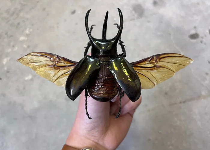 Матерые жуко-мужчины этого вида — воплощение эпичности и маскулинности. 13 сантиметров мощи закованы в хитиновые латы, блистающие на солнце черным металлом. Оружие у атласного жука тоже впечатляющее. Наш герой относится к жукам-носорогом. Но одним выростом на носу он решил не ограничиваться. Вместо этого на морде красавчика растут сразу три рога!