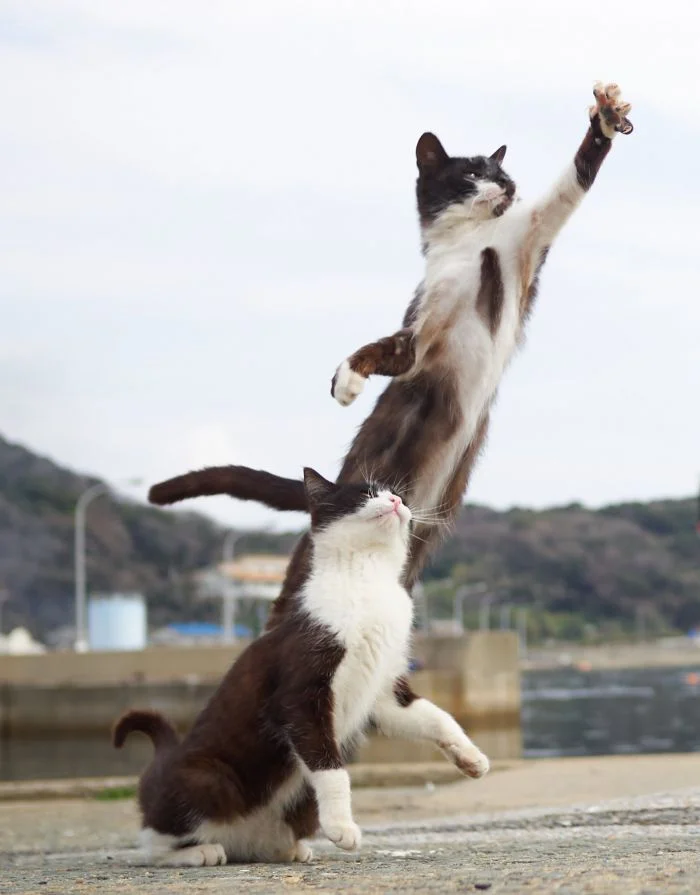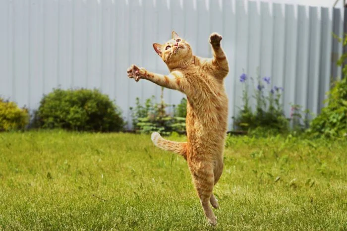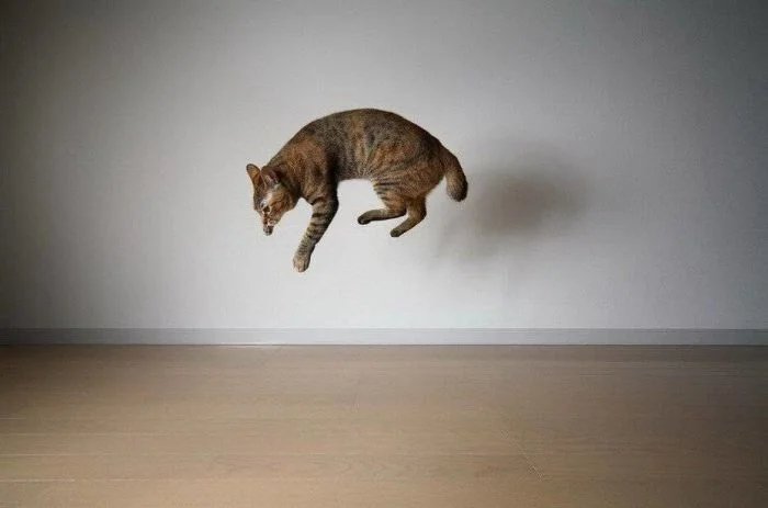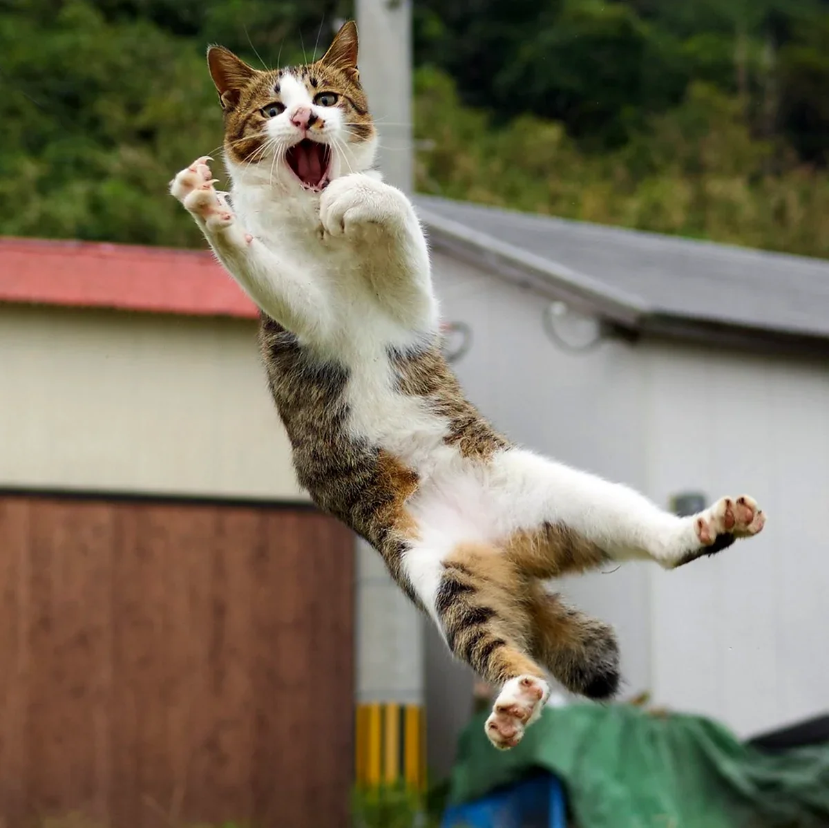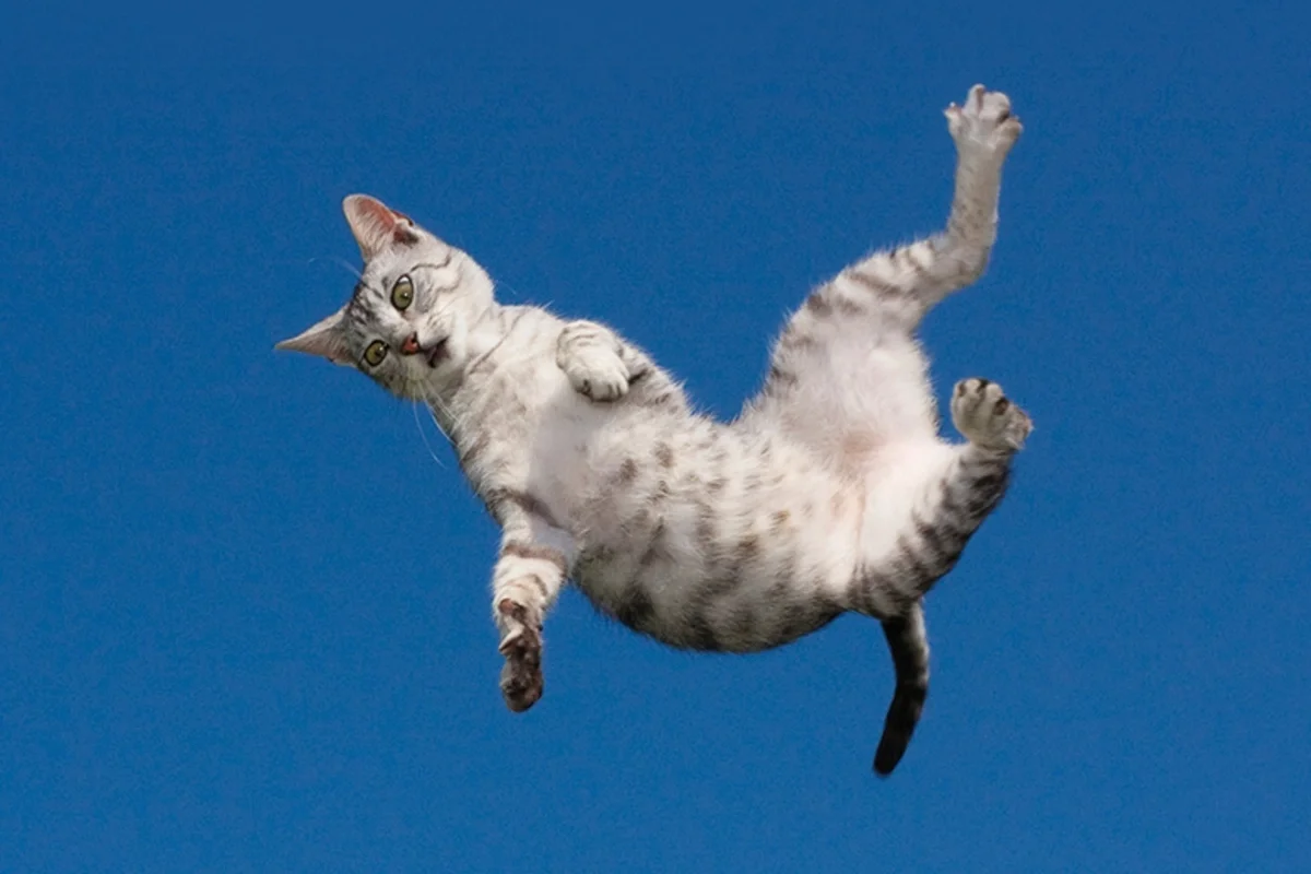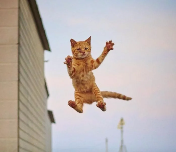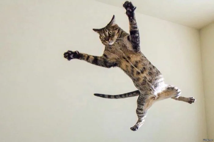 А некоторым счастливчикам повезло. Им не нужно тренироваться. И взвиться в прыжке они готовы в любом состоянии и из любого положения. Вот только что пушистый прыгун мирно посапывал или сытно обедал, как за секунду он вдруг воспаряет в такие дали, что не снились самому опытному и талантливому спортсмену. Котики – они такие. Талант к прыжкам – у них встроенная опция.
