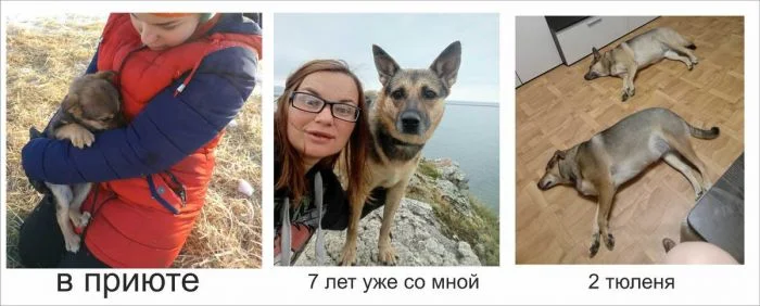 "Приехала в приют волонтёром, не планировала брать собаку... Но по итогу взяла щенка на пристройство и не смогла уже с ней расстаться!! Наша любовь уже продолжается 7 лет...)))"
