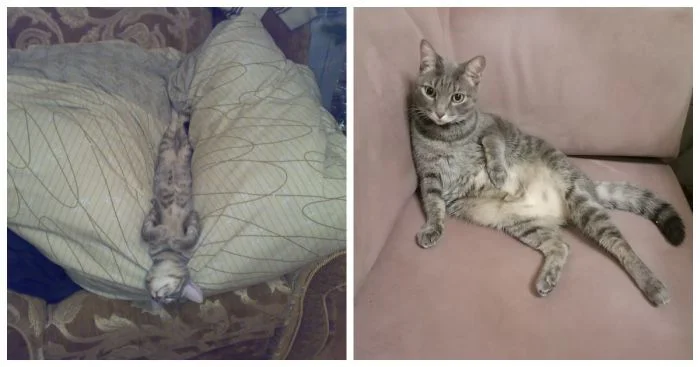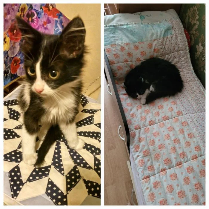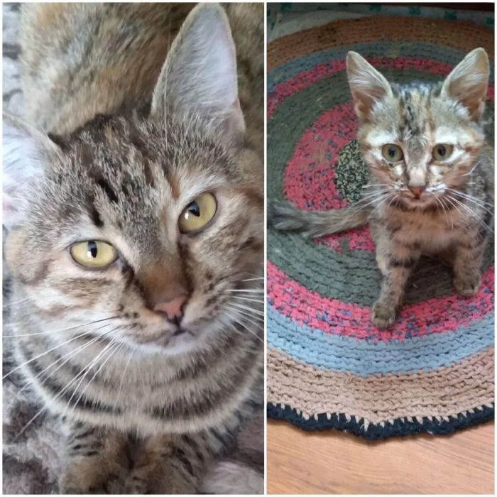 "Касяндра 11 лет назад. Подобрали в подъезде в 30-градусный мороз. Это её первый вечер у нас, где-то месяц ей был. Она же сейчас".