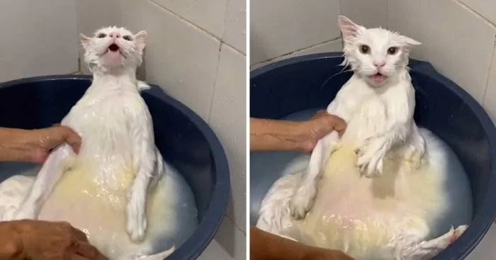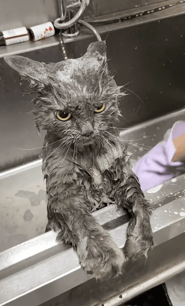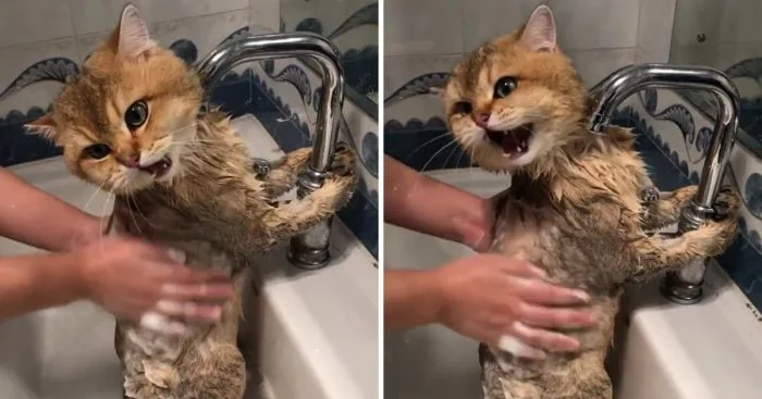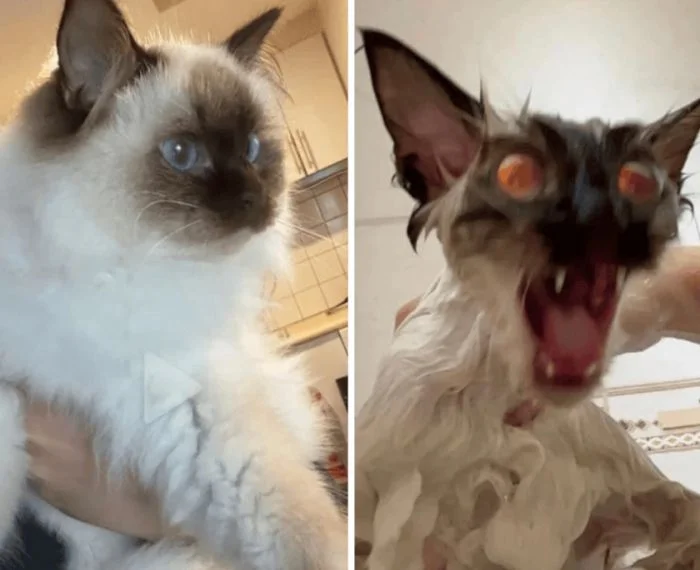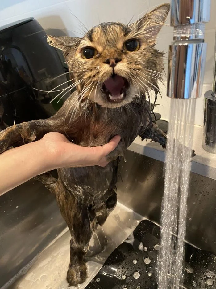 Так выглядит первое купание кошки