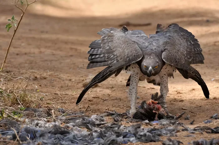 Обычно боевые орлы нападают на цесарок, уток и шпорцевых куриц. Но они достаточно сильны, чтобы охотиться на крепких крупных птиц, вроде журавля или дрофы Кори весом до 8 кило. А ещё они достаточно ловки и умелы, чтобы десятками уплетать манёвренных общественных ткачиков весом всего в 18-50 грамм!