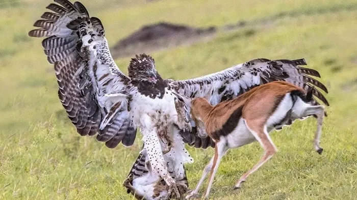Но охота на сильных и юрких пташек — это цветочки. Кенийские боевые орлы, например, научились охотиться на копытных! Причём не только на малышей, но и на настоящих взрослых антилоп. В 1974 году орнитологи из Национального парка Цаво-Ист зафиксировали, что 2 семейные пары боевых орлов за год поймали и съели 86 дикдиков Кирка — небольших антилоп весом до 8 кило. Но это не предел: особо отбитые орлы умудряются в одиночку расправляться с кустарниковыми дукерами — антилопами весом до 37 килограмм.