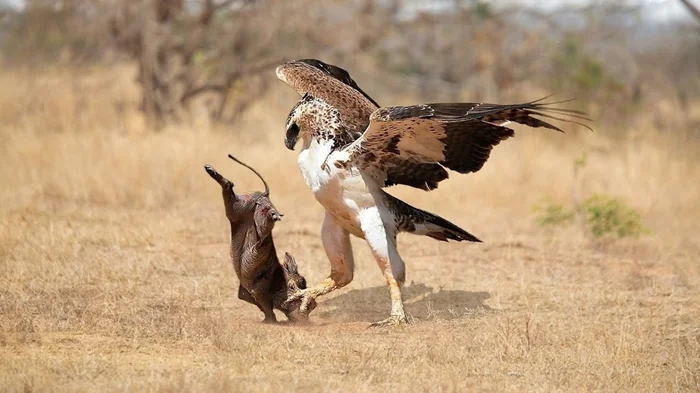 На фото юный боевой орел. Это можно заметить по другому цвету пера. Как видите, он уже успешно справляется с тем, чтобы охотиться на чужих детенышей.
