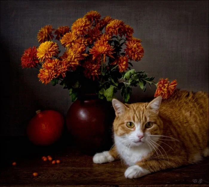 Возможно, именно поэтому фотографии, на которых запечатлены кошки и хризантемы, а также другие осенние цветы, дарят вдохновение, тихую нежность и предвкушение особенных моментов и тёплых мгновений.