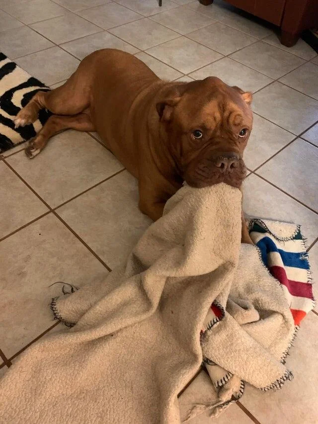 Мама нечаянно заказала лежанку не того размера, но наш пёс всё равно благодарен