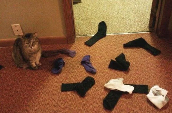 Кошка любит приносить нам носки. Вот, что мы увидели, когда вернулись из поездки