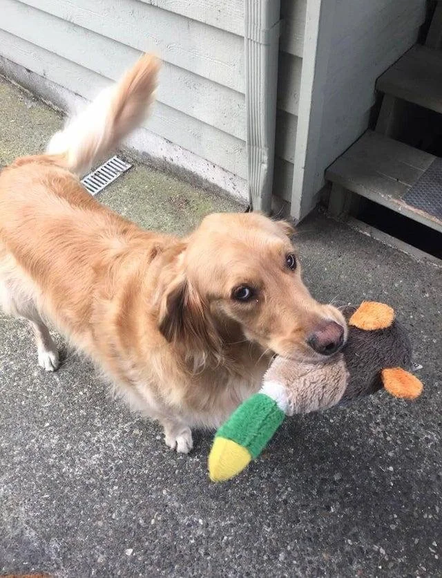 Из-за проблем со здоровьем я редко выхожу на улицу. Каждый раз, когда меня видит соседский пёс, он быстро бежит к себе домой и приносит одну из своих любимых игрушек. Сегодня это уточка.
