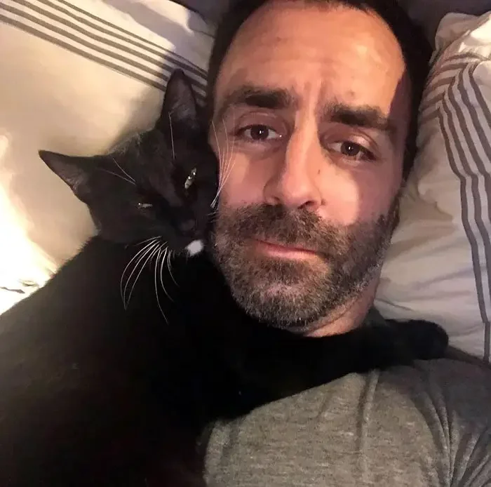 1. Мой парень работает дома, но наш кот Саймон настаивает на том, чтобы его часто держали на руках. Нам пришлось сделать специальную повязку для него