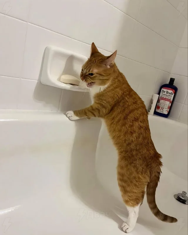 У этого рыжего балбеса есть странная привычка. Он постоянно пытается скушать мыло. Но вкус ему, естественно, дико не нравится. Хозяин уже не знает, как объяснить рыжему, что мыло - не еда. Даже предупреждающие картины в доме развесил!