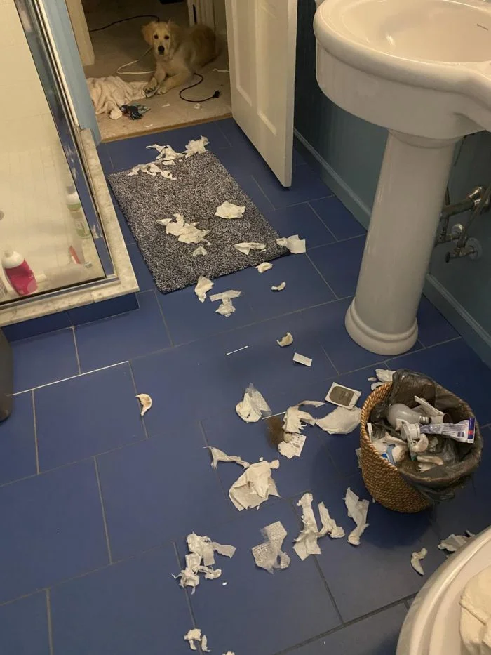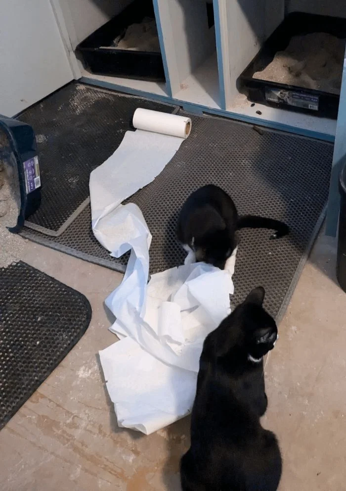 5. Эти хулиганы размотали и порвали туалетную бумагу. Хотели прикрыть то, что промахнулись мимо лотка