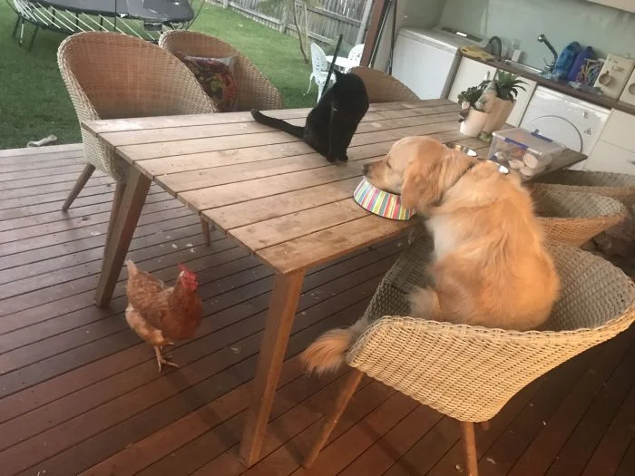 10. Мне приходится кормить его за столом, потому что курица и кошка воруют его еду
