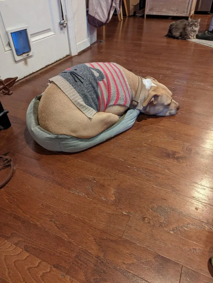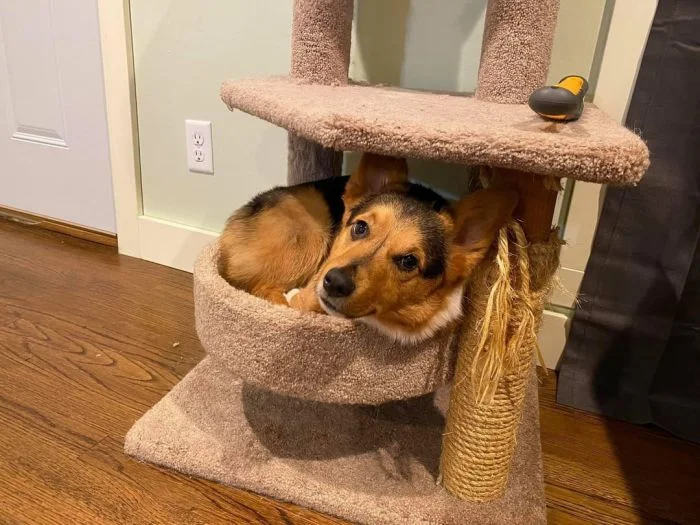 15. Наш корги всегда спит в кошачьем домике