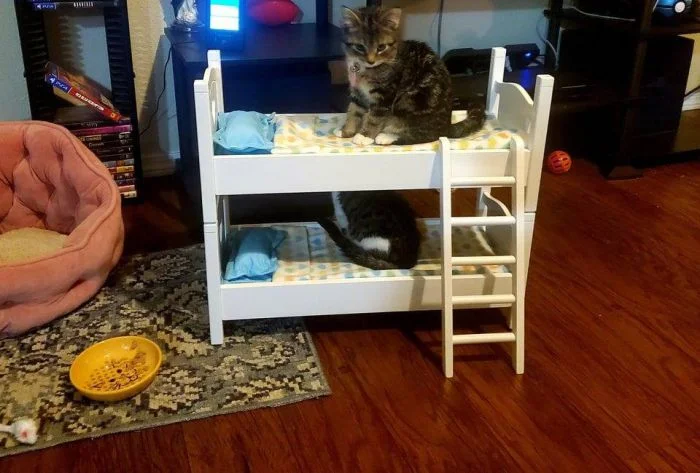 Один из наших котят обожает спать в ванночке для кукол, которая принадлежит моей дочке.