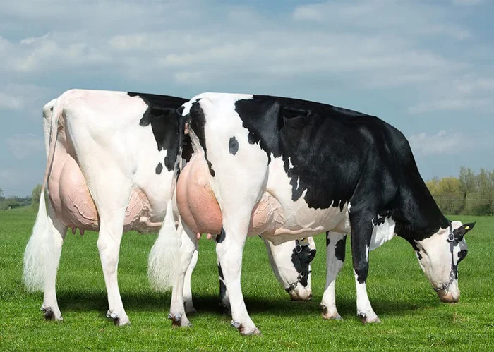 Это коровы голштинской породы. Они — гордые обладательницы крупнейшего вымени среди других коров.