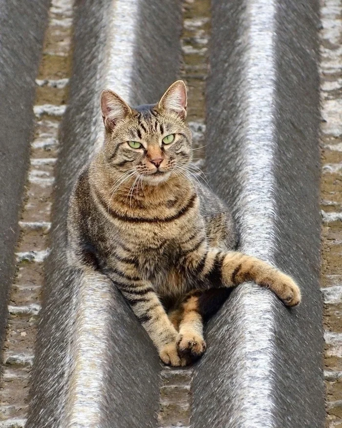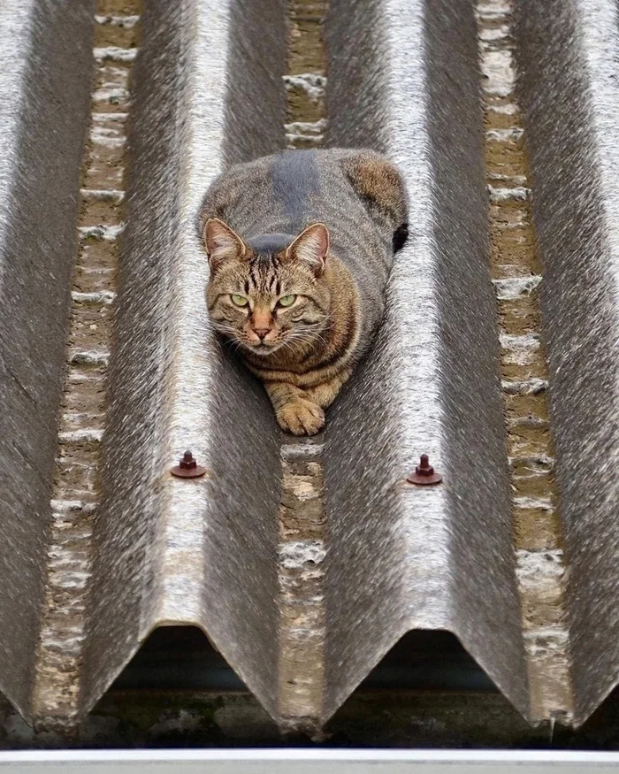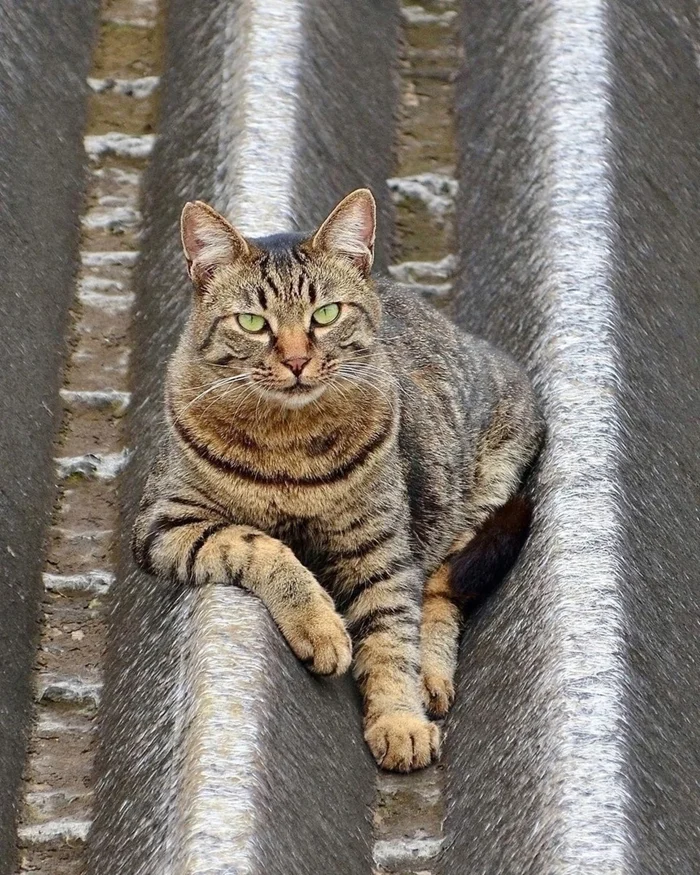 Этот кот на крыше покоряет своей фотогеничностью и грацией! Смотрите, как пушистый красавец превращает каждое фото в произведение искусства.