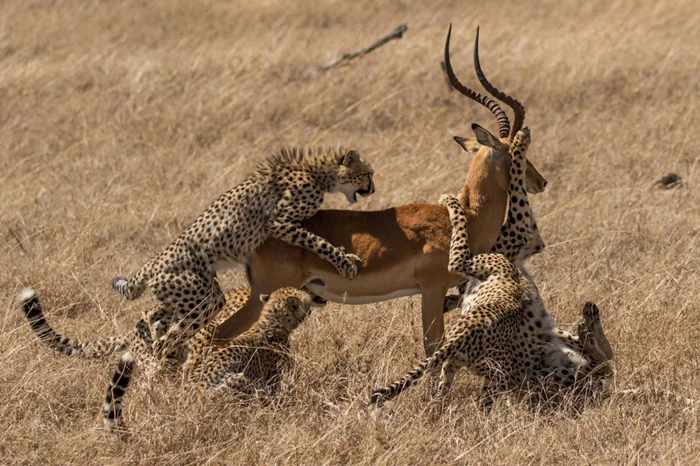 Одному гепарду под силу одолеть максимум спрингбока — небольшую антилопу весом до 45 кг. А вот группа способна охотиться даже на крупных копытных, таких как антилопы-гну и зебры.