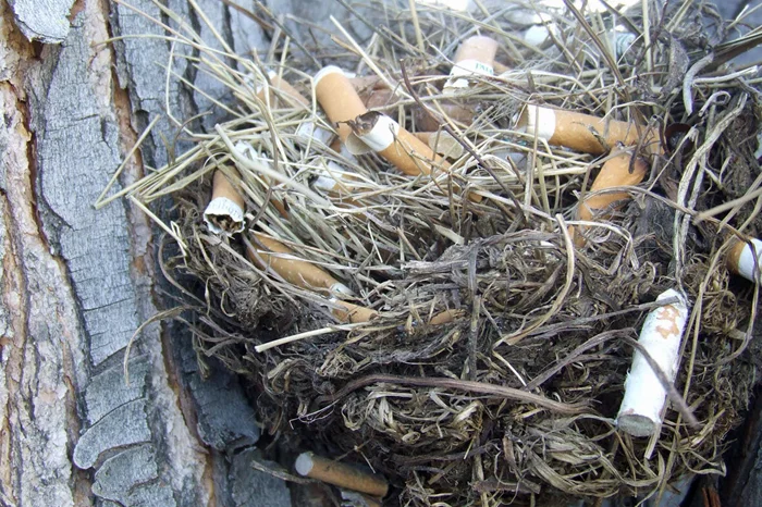 Смекалку воробушки применяют не только в поисках пропитания, но и в обустройстве гнезда. Они стали одними из первых птиц, в гнездах которых ученые обнаружили сигаретные бычки. Зачем птицы захламляют собственную квартиру? Как ни парадоксально — для чистоты! Дым и смолы — идеальные инсектициды. Так воробьи избавляются от паразитов-пухоедов, которые докучают и птенцам, и взрослым.