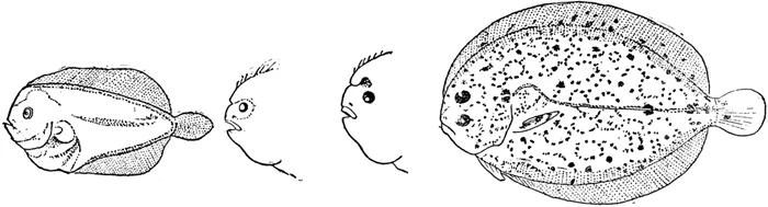 Примерно так происходит процесс перемещения лица по голове у всех представителей отряда камбалообразных.
