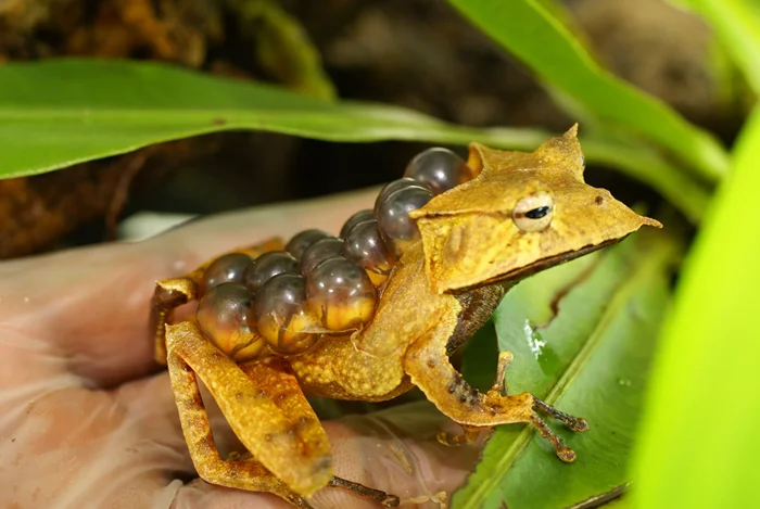 У каждого вида хемифрактид процедура выращивания детей немного отличается. Кто-то буквально засовывает икру себе под кожу, а кто-то просто носит на спине, как особь на фото.