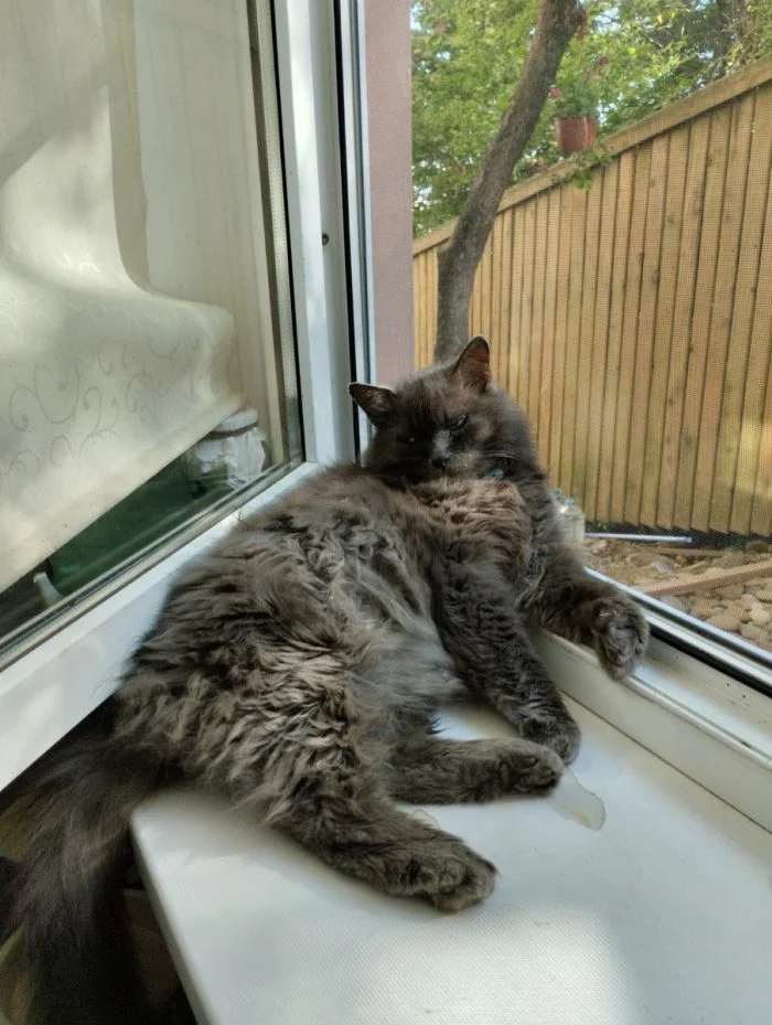 Ольга Тузовская: Этот весь больной бабайка найден в коробке на улице ещё слепым котёнком. Кормили из бутылочки. Долго лечили. Вот такой наглец в итоге вырос.