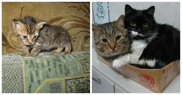 ИннаЗайцева -ЛапкиЦарапки: Крошечный, несчастный, обезвоженный 2-х - недельный найденыш Кузя летом 2017 года... И этот же Кузя с дружбаном Максом (тоже найдёныш и тоже крошечным котенком) в 2024 году.