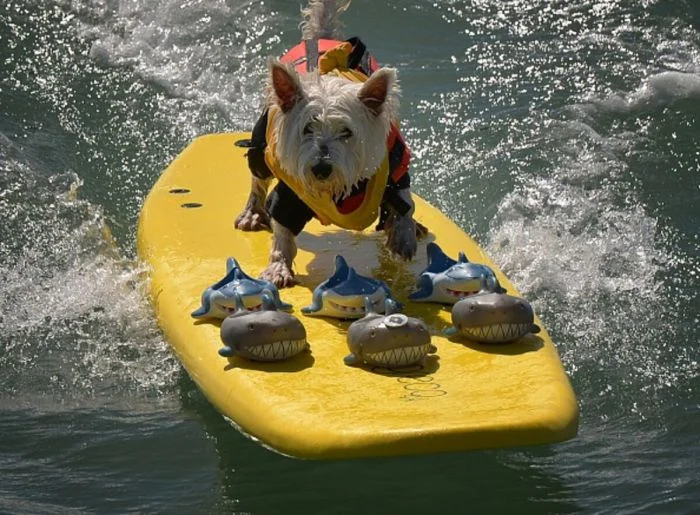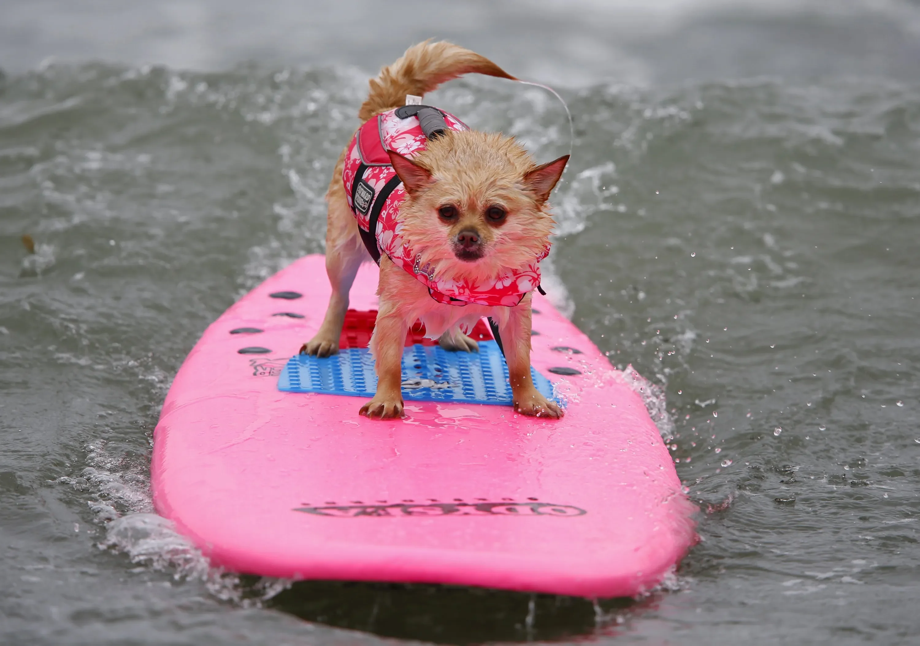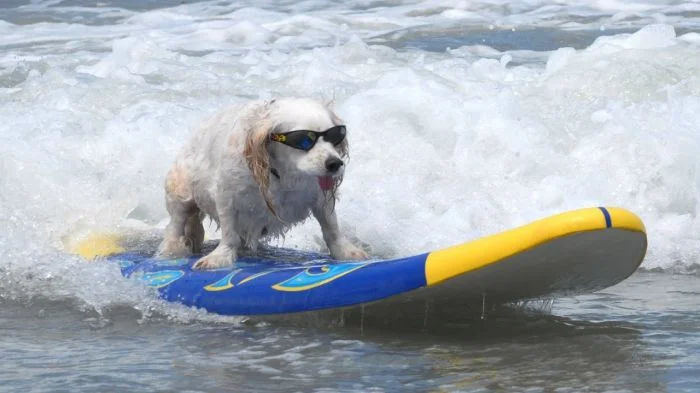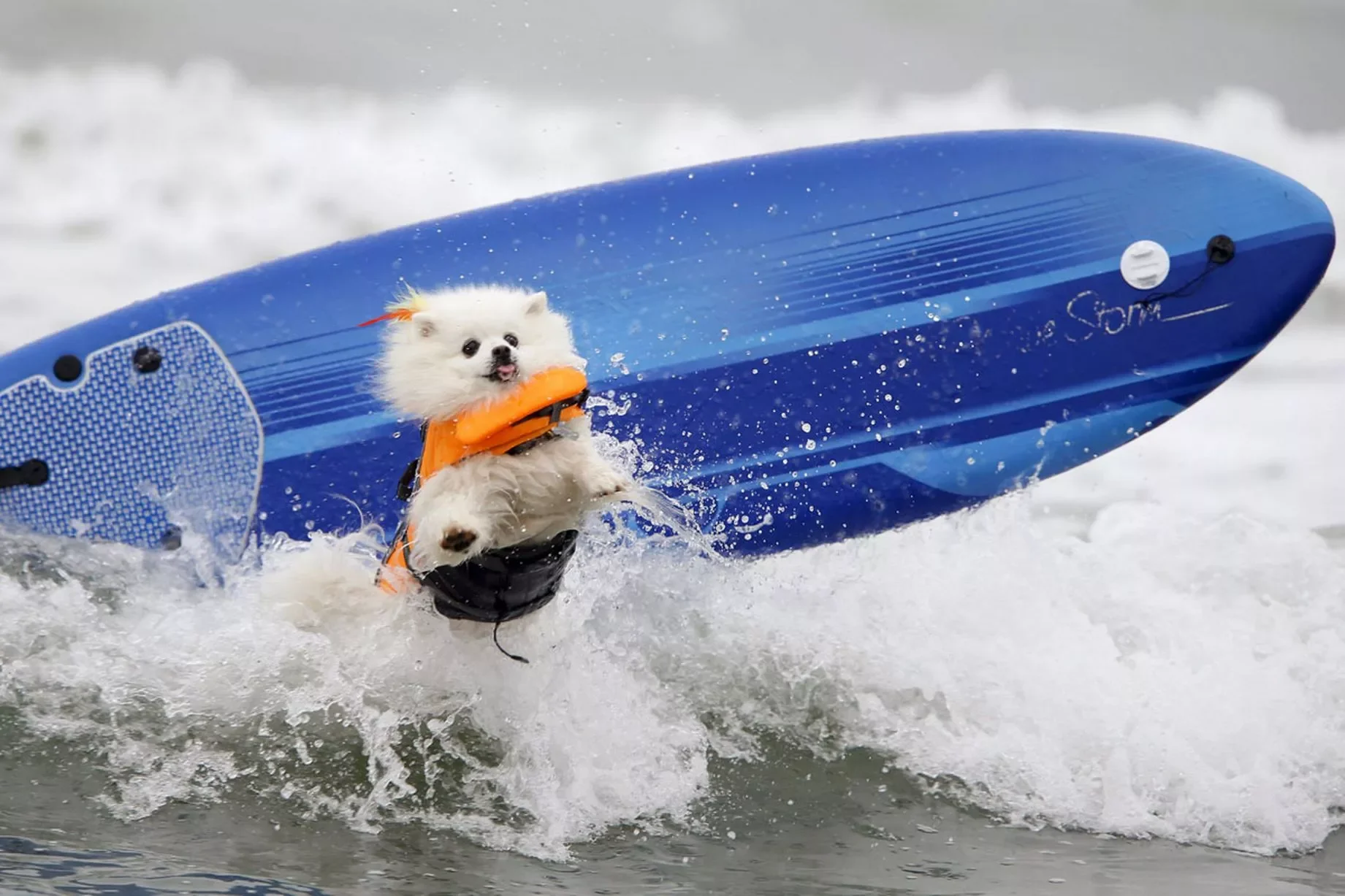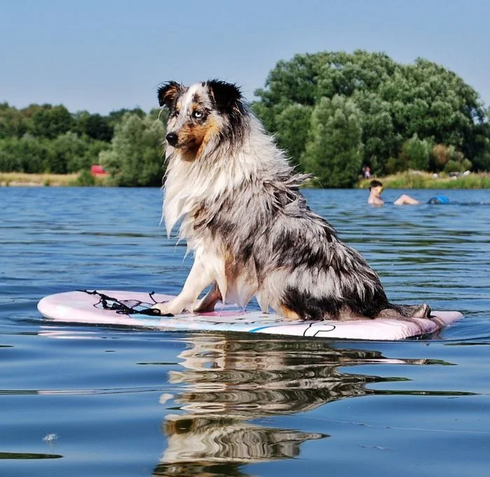 Некоторые пёсели - профессиональные сёрферы, они словно родились на доске и сразу отправились покорять волны. Другим четвероногим спортсменам нужны долгие тренировки, которые начинаются в детском бассейне. Это называется балансом. Но все покорители водной стихии в процессе выглядят неподражаемо и очень трогательно.