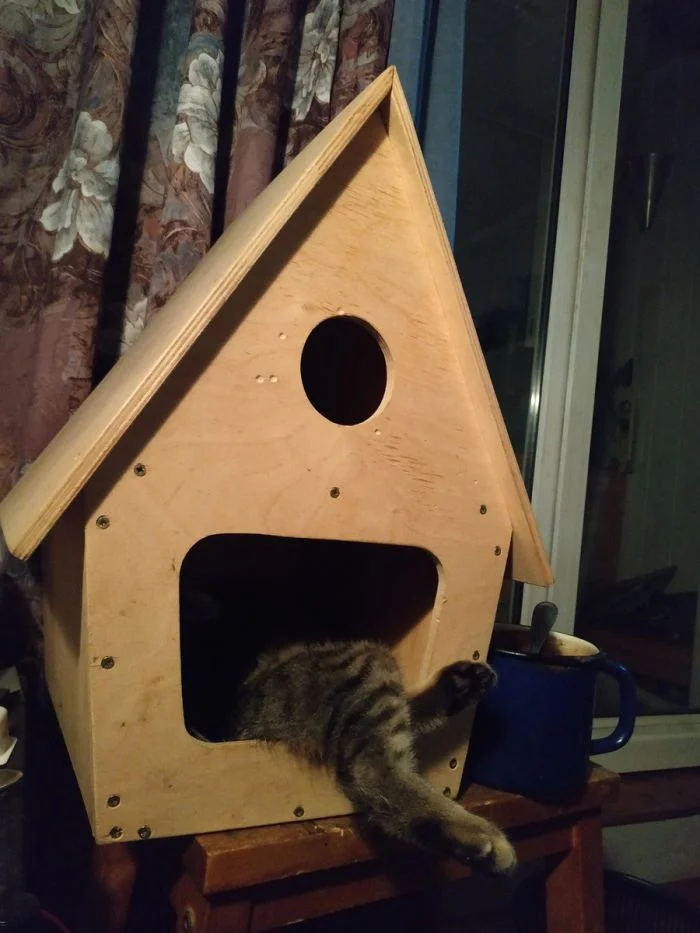 Алексей Лакеенков: Это Вася, подобрали под Рязанью, очень далеко от жилья. Домик делали для кошки, но она не оценила, так что котик обзавёлся столичной недвижимостью.