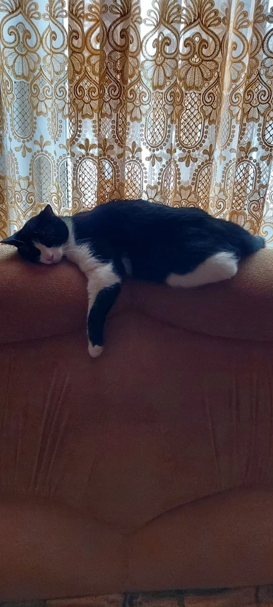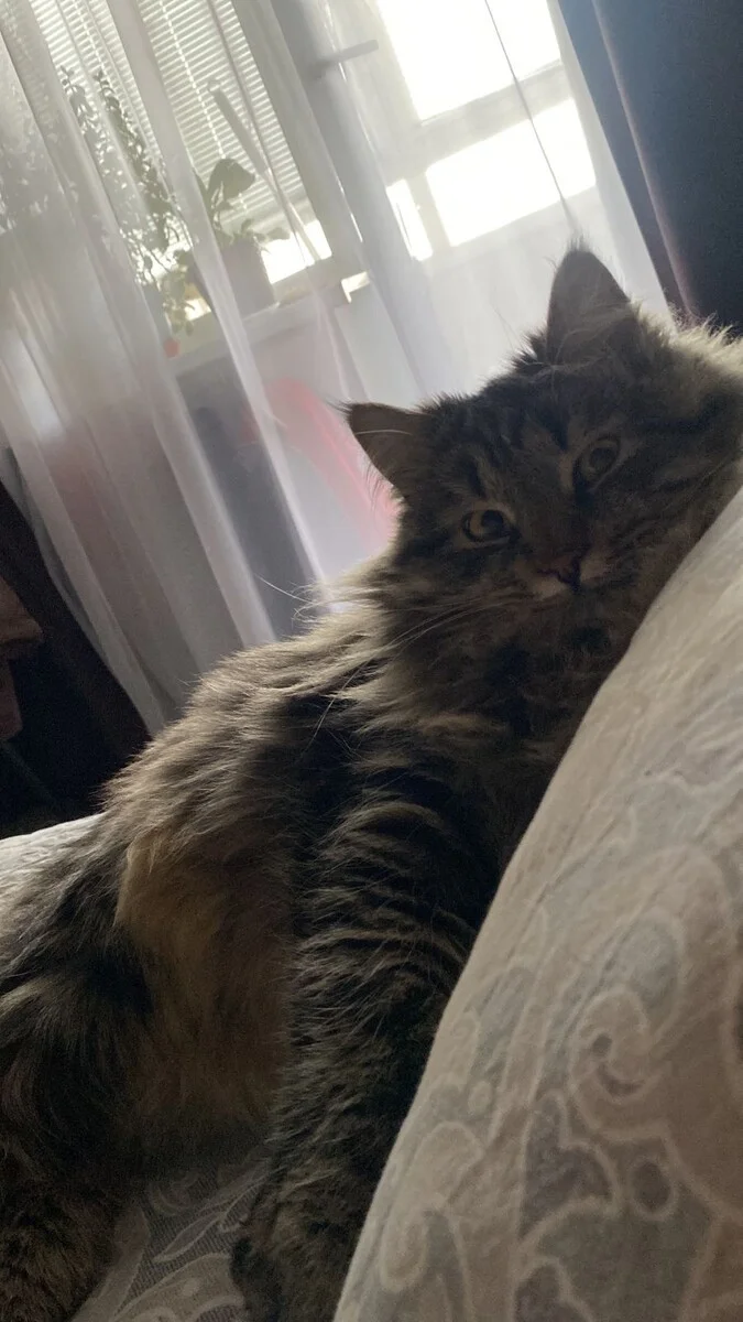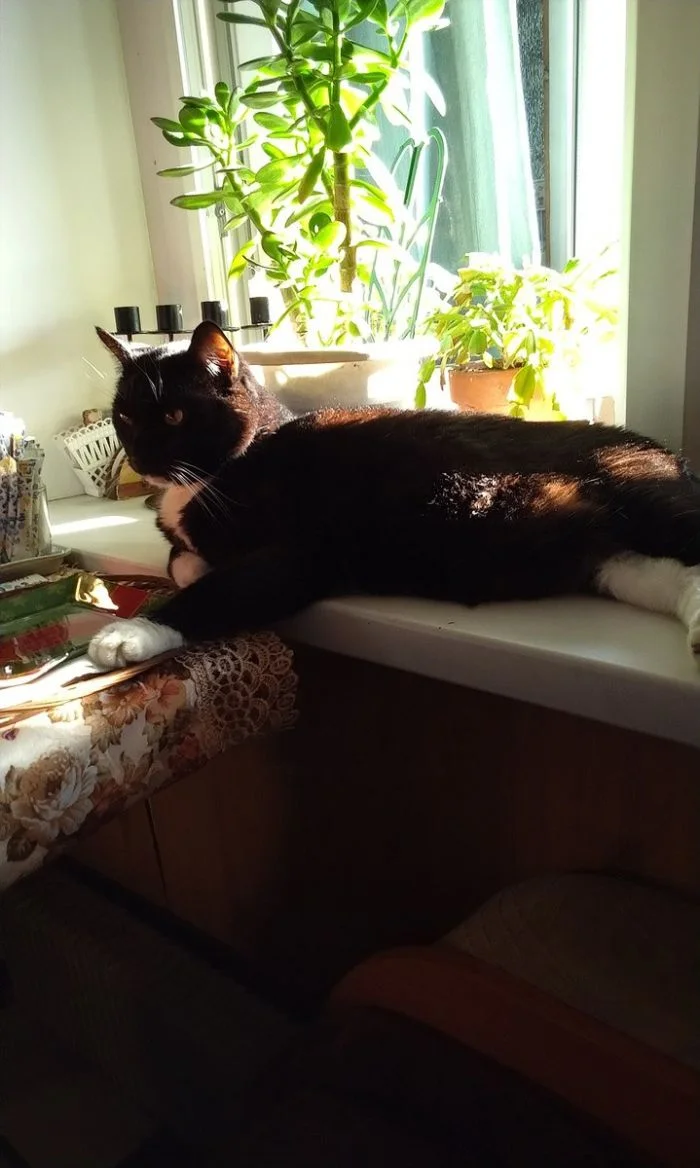 Antonina: Котик прибился к дому, брошенный. На улице ему было очень холодно, ютился то на перилах, то на скамейке. Забрали домой.