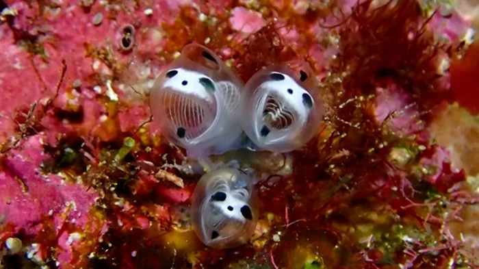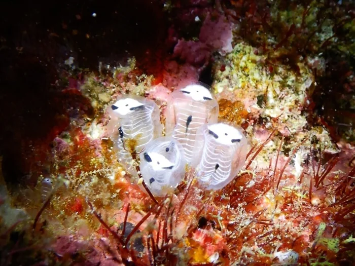 На самом же деле существа относятся к классу асцидий. Это достаточно простые по строению животные. Всё, что вы видите на картинке — результат нашего воображения. Нет у них морды и глаз — это просто удачное расположение пигментных пятен. И костей тоже нет, эти «рёбра» — кровеносные сосуды, что просвечивают сквозь прозрачное тело морского обитателя.