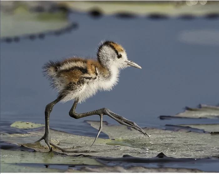 Птенец яканы гордо вышагивает на своих четырёхпальцевых ногах.