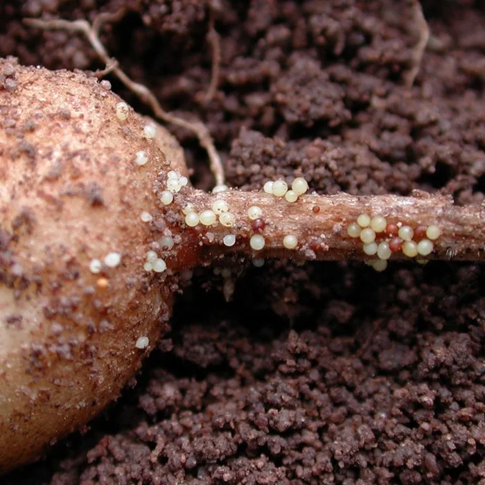 Золотистая картофельная нематода — крошечный червяк-паразит растений семейства паслёновых. Бело-золотистый, вырастает до 1 миллиметра в длину. А вот эти круглые жёлтые шарики на фото — цисты нематоды, то есть яйца этих червей с сотнями крошечных личиночек внутри.