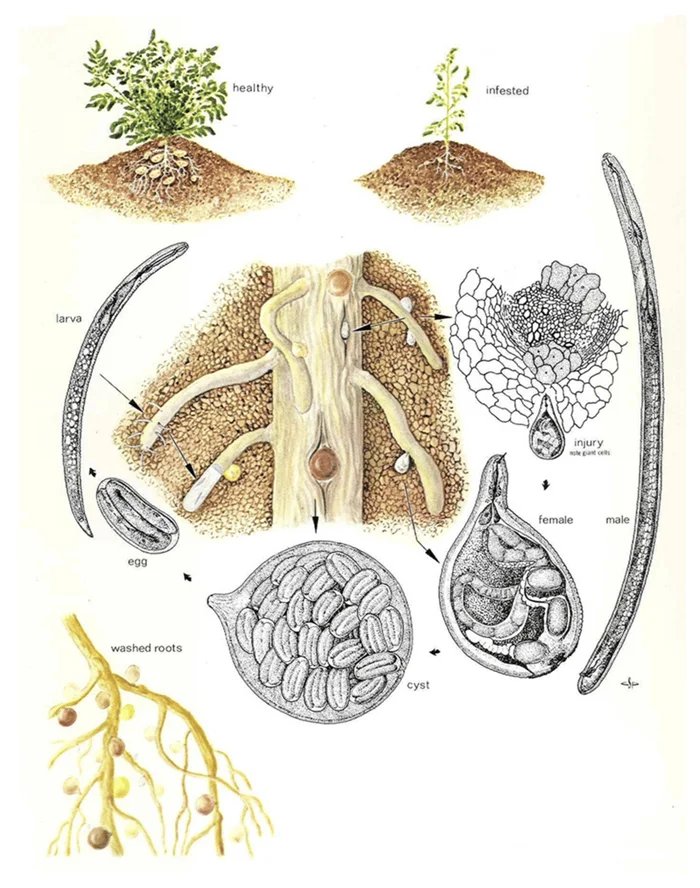 Нематомужи погибают сразу после спаривания, нематодамы — чуть позже. Через некоторое время их внутренние органы прекращают работу, а тушка превращается в цисту — этакий кокон для будущих червячков. Одна самка способна произвести на свет до 600 личинок! Вот почему так важен карантин.