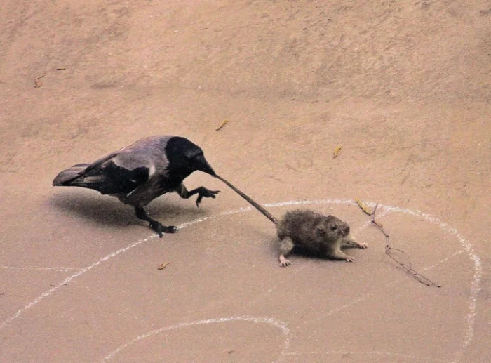 Иногда бывает так, что птицы целенаправленно кого-то дразнят. Чаще всего мишенью приколов становятся соседи по каменным джунглям: кошки, собаки, крысы и другие птицы. Каркуши то за хвост кого-то дернут, то за ухо цапнут, то за попу ущипнут. Конечно, такое поведение не всегда имеет игровую природу. Назойливые приставания птицы используют для отвлечения конкурентов от еды, защиты гнезда или птенца-слетка. Но иногда происходит так, что видимых причин нет, а тычки из-за угла — есть.