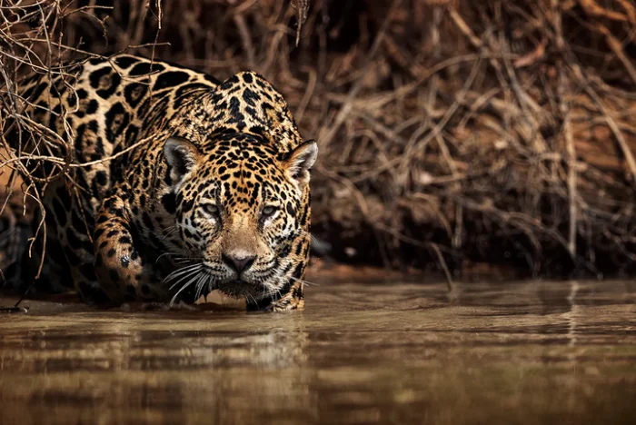 В отличие от наших котиков, ягуары охотно плавают и даже ловят рыбу. Но под водой они выглядят поистине инфернально.
