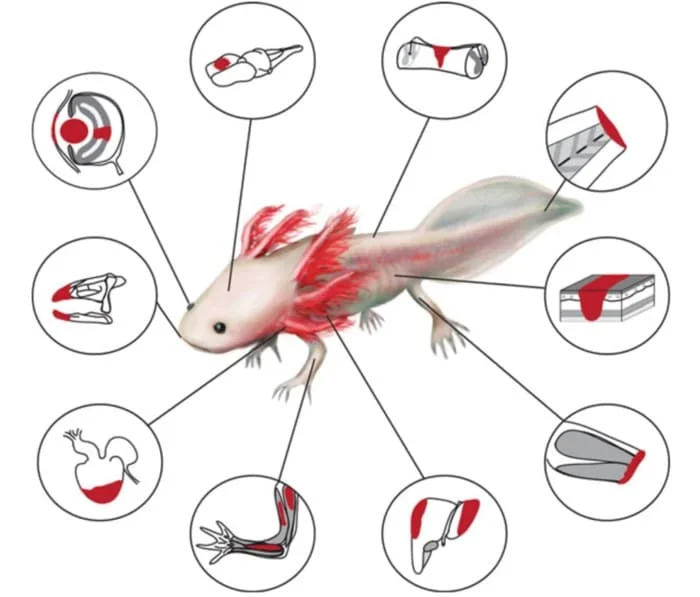 Аксолотль живёт по принципу: "Что не убивает сразу — не проблема". Он может восстанавливать конечности, хвост, глаза и внутренние органы, включая сердце и мозг (если повреждения не смертельны). Среди позвоночных у него лучшие регенеративные способности, но не среди всех живых существ.