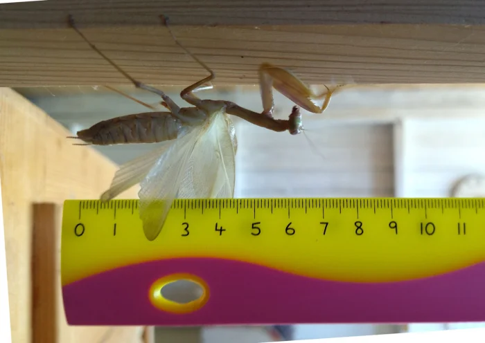Теперь её длина составляет около 7 см, что означает завершающую стадию роста: наша героиня относится к виду "богомол обыкновенный", самки которого редко превышают 7,5 см в длину.