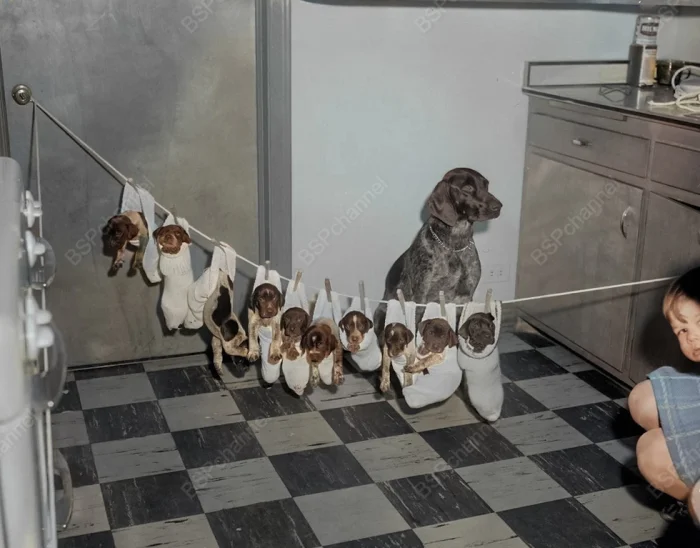 Щенки сушатся на веревке, 1960-е.