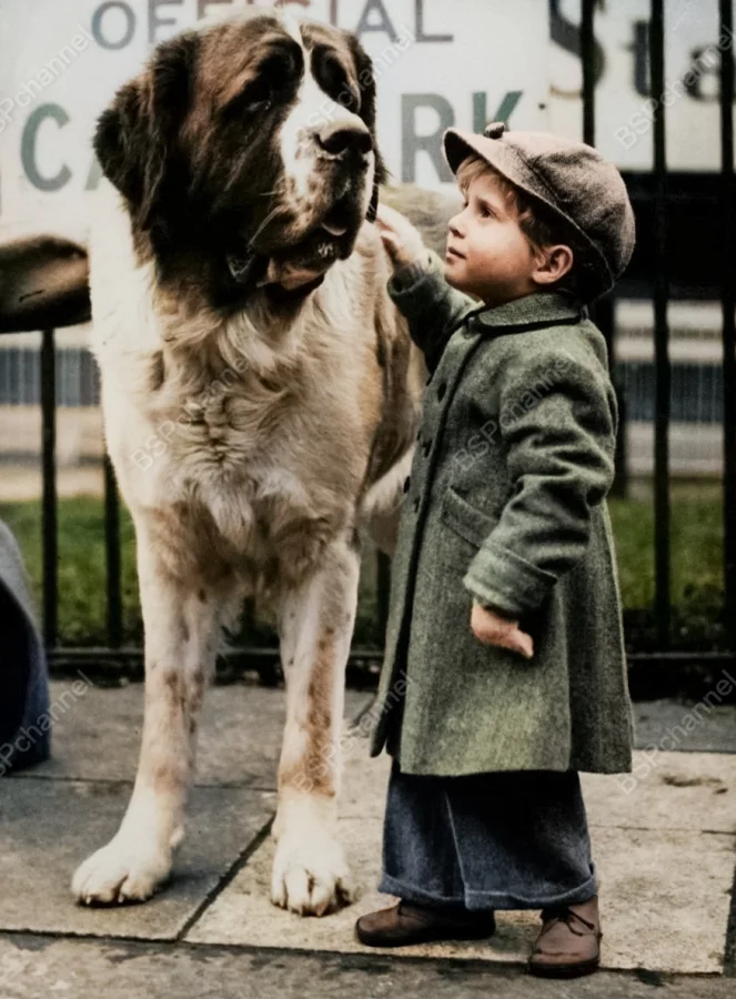 Мальчик со своим сенбернаром на выставке собак "Крафтс". Лондон, 1950 год.