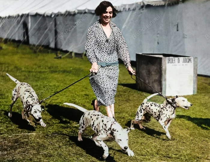 Три далматинца и их счастливая хозяйка после того, как они выиграли первый приз на Лондонской выставке собак в 1929 году в Лондоне.