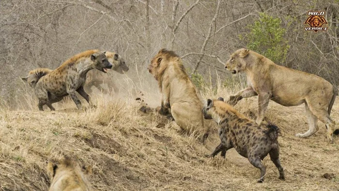 В голодные времена происходят масштабные столкновения между львами и гиенами.