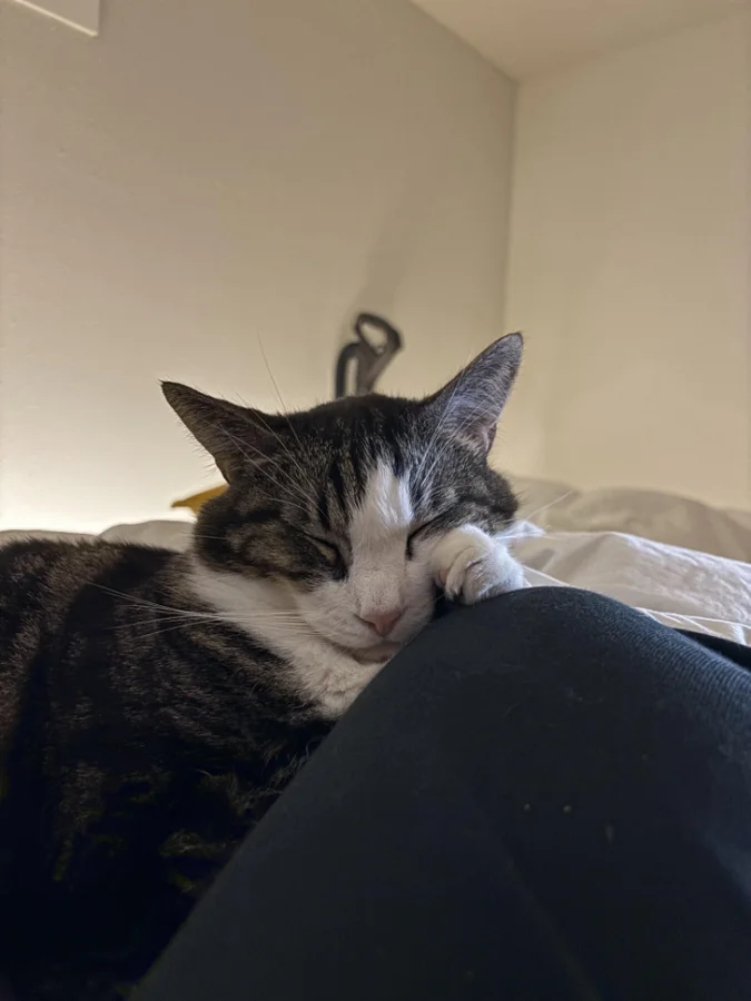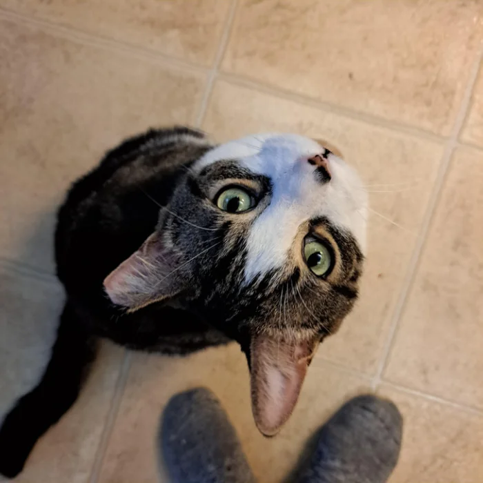Ветеринар познакомила меня с семилетним котом, которого они пытались пристроить. Он был серым и не совсем здоровым, так как его подобрали прямо с улицы. Врачи предупредили меня, что он боится мужчин, но животное почти сразу успокоилось, как только я зашел в кабинет. Кот запрыгнул на стол, позволил себя погладить и даже подержать на руках. На следующий день я позвонил в клинику и подтвердил, что приючу его. С января 2023 года он стал моим верным другом.