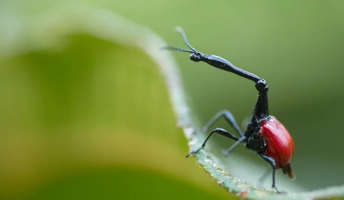 Окраска тела насекомого чёрная, надкрылья красные, а голова вытянута в головотрубку, которая направлена вперёд.