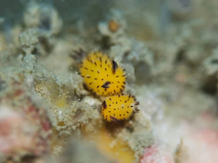 Вот перед вами удивительные морские слизни — Jorunna parva, которых часто называют морскими кроликами. Их тело покрыто мельчайшими игольчатыми структурами, создающими иллюзию мягкого меха. На голове этих существ расположены чувствительные ринофоры, напоминающие заячьи ушки. А в задней части тела можно заметить внешние жабры, похожие на пушистый хвостик.