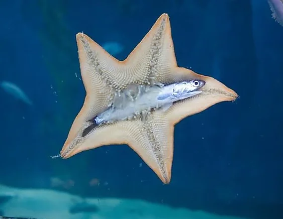 Но самое удивительное в жизни морской звезды — это её способ питания. У этого животного два желудка: первый — пилорический — расположен глубоко внутри тела, и от него в каждый из пяти лучей-конечностей простираются по два пищеварительных отростка. Второй желудок — кардиальный — находится непосредственно над ротовым отверстием, расположенным на нижней стороне тела. Именно этот желудок обладает уникальной способностью выворачиваться наружу, охватывая добычу и начиная процесс пищеварения прямо на поверхности пищи.