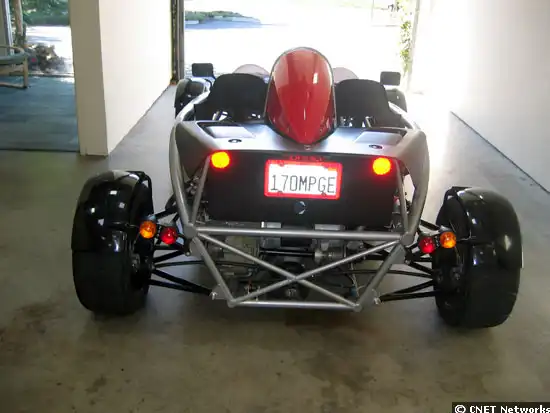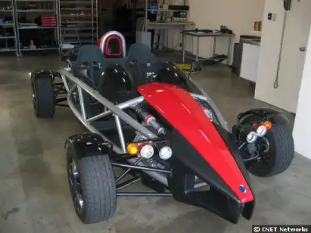 Это Ариэль Атом. Двигатель бензиновый, 300 л. с. Из-за малого веса у машины отличная динамика и управляемость. До 100 км\ч разгоняется за 3,5 секунды.
